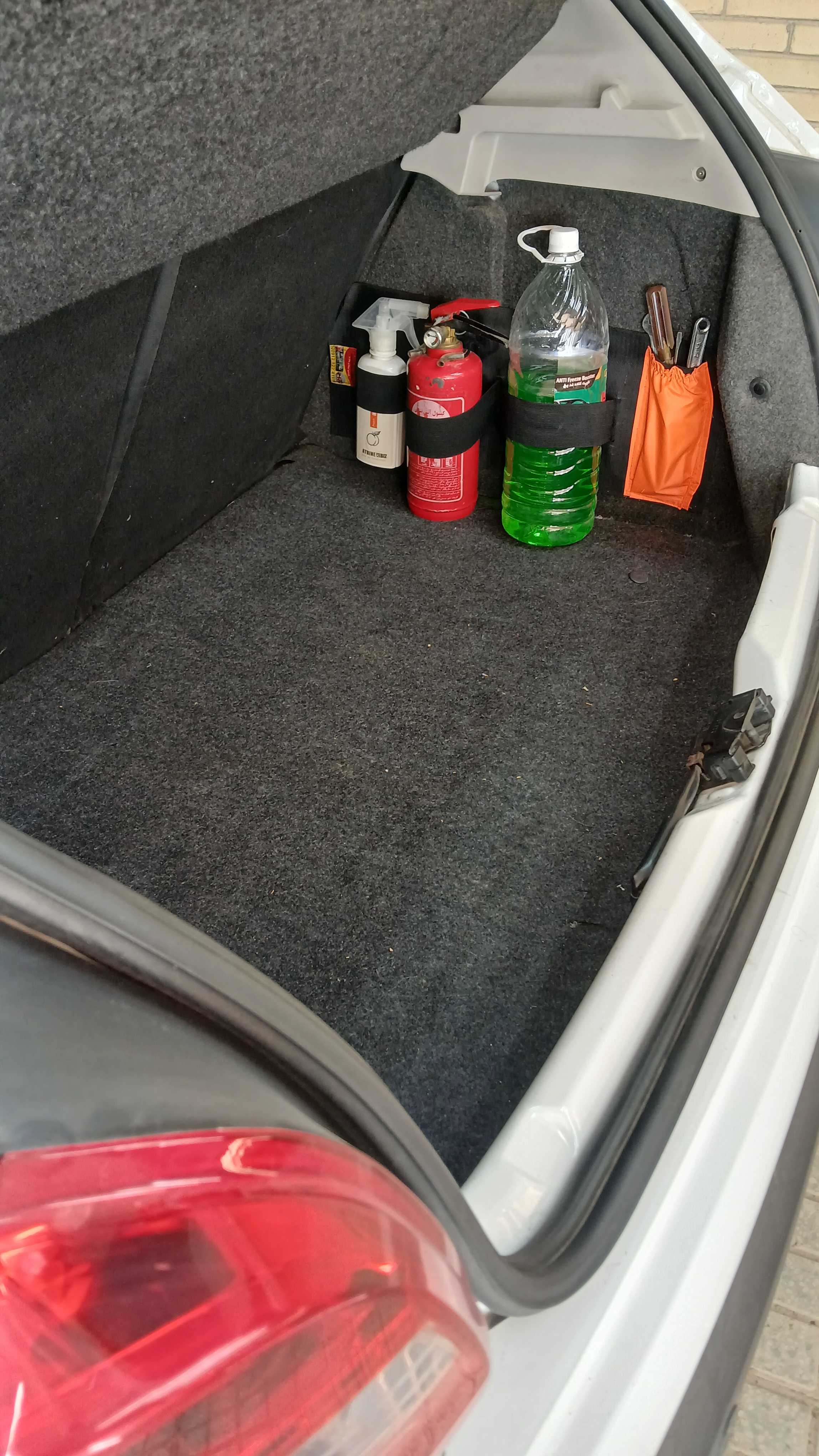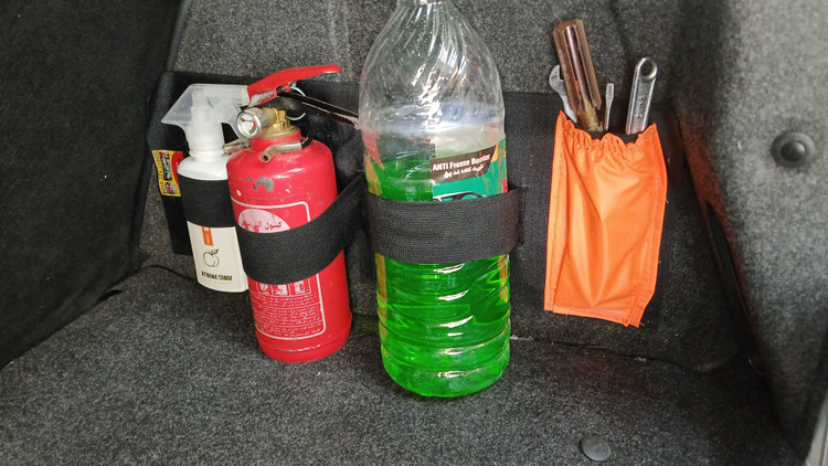 نظم دهنده 50 سانتی با 3 محفظه بزرگ و کاربردی برای نگهداری کپسول آتشنشانی، منبع آب رادیاتور، اسپری آبپاش و 1 محفظه برای آچارهای ضروری و مورد نیاز با نصب آسان بدون هیچ ابزار و سوراخکاری به نمد صندوق عقب خودرو میچسبد
